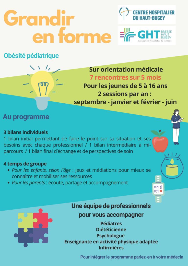 Si vous avez des enfants de 5 à 16 ans à adresser à ce programme, vous pouvez nous faire parvenir avant le vendredi 05 décembre 2025 le courrier d’adressage ci-joint, soit par mail secretariat-pediatrie@ch-hautbugey.fr soit par courrier postal à l’adresse suivante: