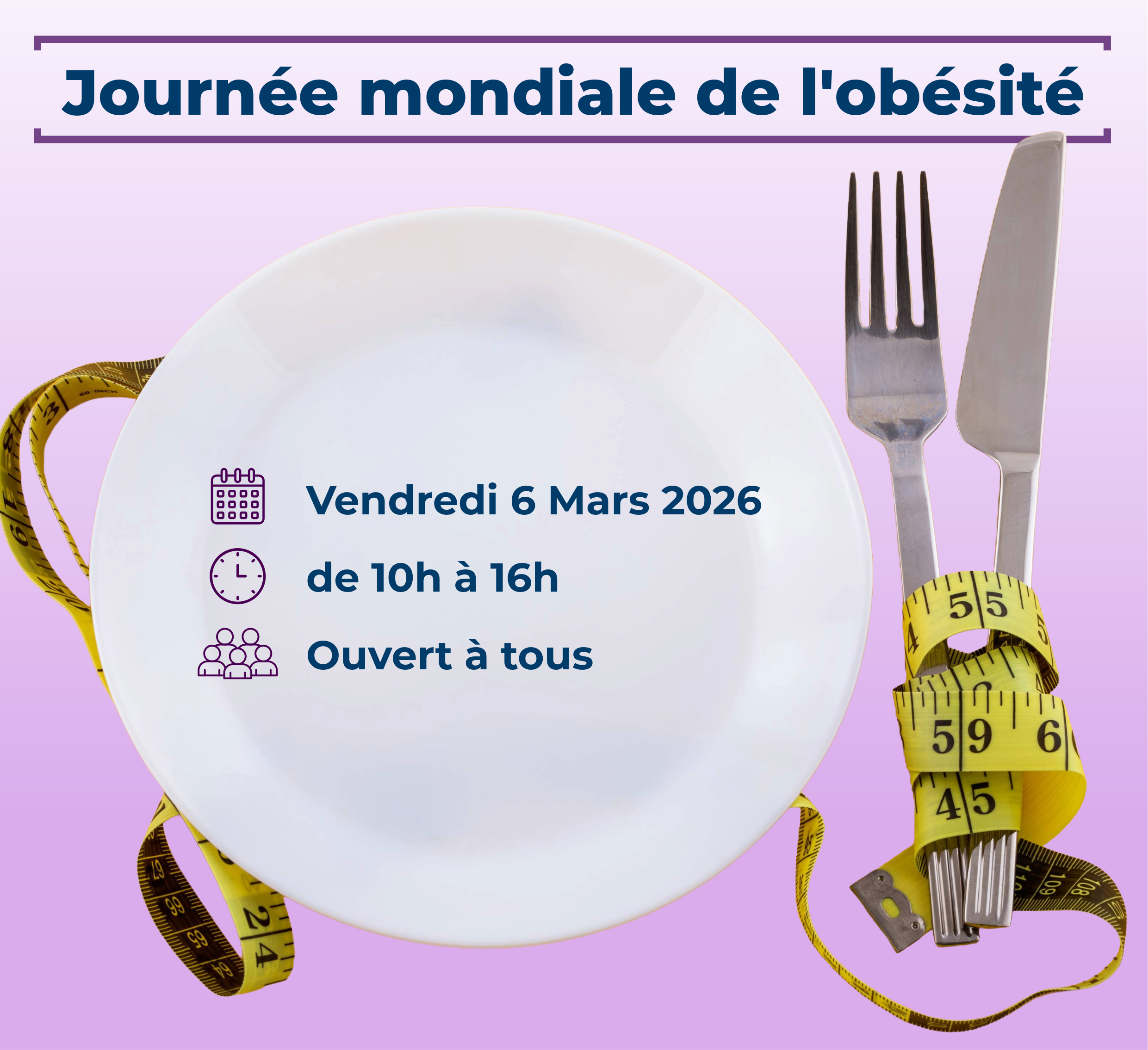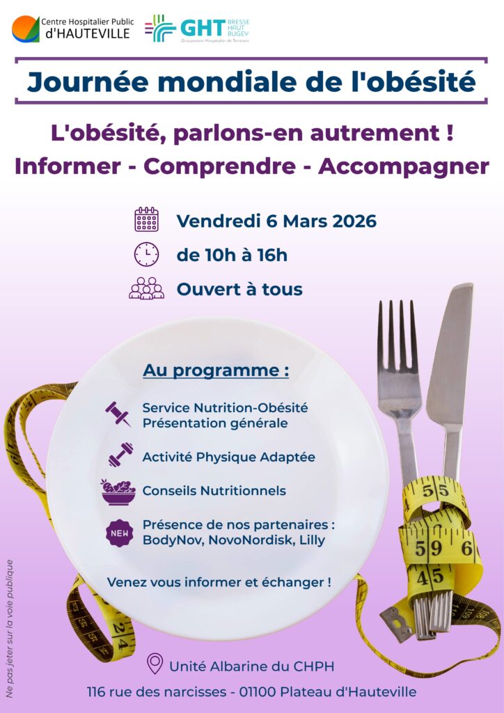 Vendredi 6 mars 2026, dans le cadre de la journée mondiale contre l’obésité, le Centre Hospitalier Public d’Hauteville invite les professionnels et le grand public à venir rencontrer ses équipes et ses partenaires pour s’informer et se sensibiliser à cet enjeu de santé publique.