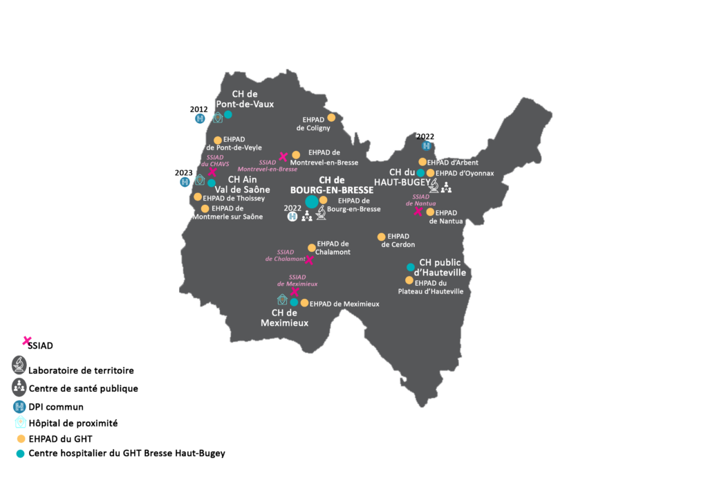 Le GHT Bresse-Haut-Bugey a été créé en 2017. Ce dispositif encadré par la loi n°2016-41 du 26 janvier 2016 de modernisation de notre système de santé (article 107) et le décret n°2016-524 du 27 avril 2016, amène, entre autres, à établir un projet médical partagé par l’ensemble des établissements membres du Groupement Hospitalier de Territoire. Ce projet est renouvelé périodiquement.